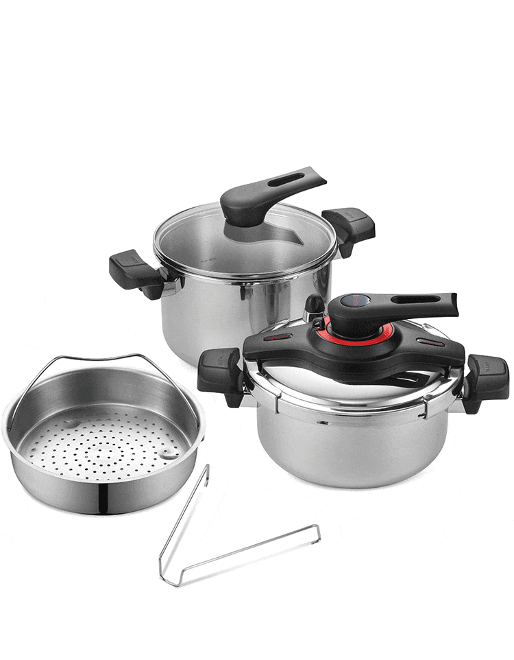 Bộ nồi áp suất Inox từ tính POONGNYUN (PN) 3 trong 1 VGPC2-SET thế hệ mới này đã tích hợp nắp áp suất, nắp thủy tinh chịu nhiệt, xửng hấp có quai xách và rế được thiết kế phù hợp với 2 dung tích nồi áp suất giúp người sử dụng như vừa là nồi áp suất, nồi nhà bếp và nồi hấp theo nhu cầu thực đơn của từng món ăn mà không cần phải bỏ thêm chi phí mua thêm dụng cụ nhà bếp. Ngoài ra với thiết kế 3 trong 1, các bà nội trợ có thể nấu nhiều món món ăn cùng lúc vô cùng tiện lợi mà còn tiết kiệm nhiều thời gian cho việc nấu nướng.