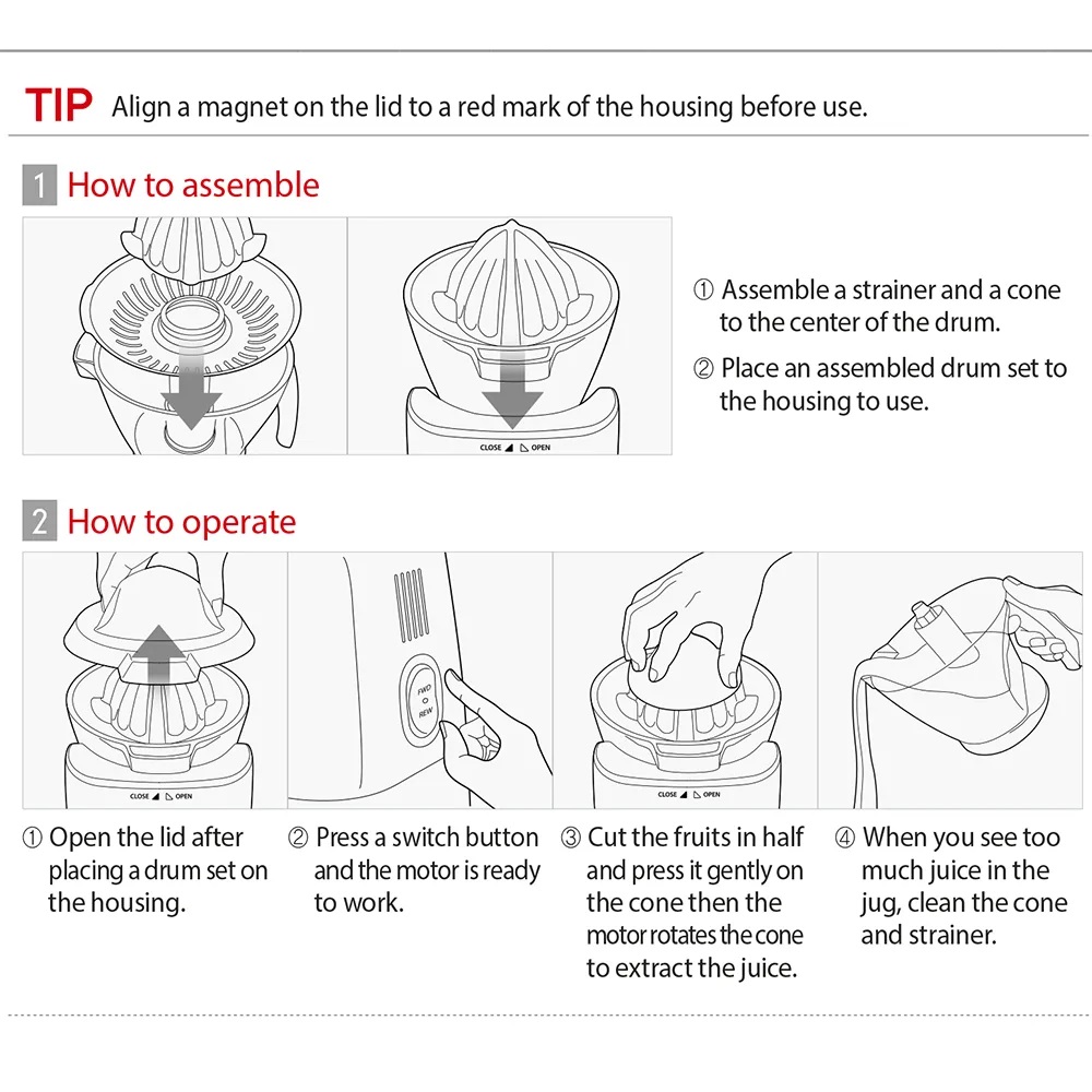 – Với dung tích 800ml, bạn dễ dàng chiết xuất được nhiều nước trái cây bằng cách cắt một nửa mà không cần phải rửa trái cây có múi họ cam quýt.